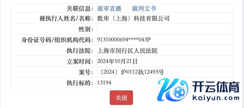 蓝鲸新闻11月26日讯(记者张书维)日前开云体育,蓝鲸新闻细心到,数库(上海)科技有限公司(下称“数库科技”)被上海市闵行区东说念主民法院发布限消令。