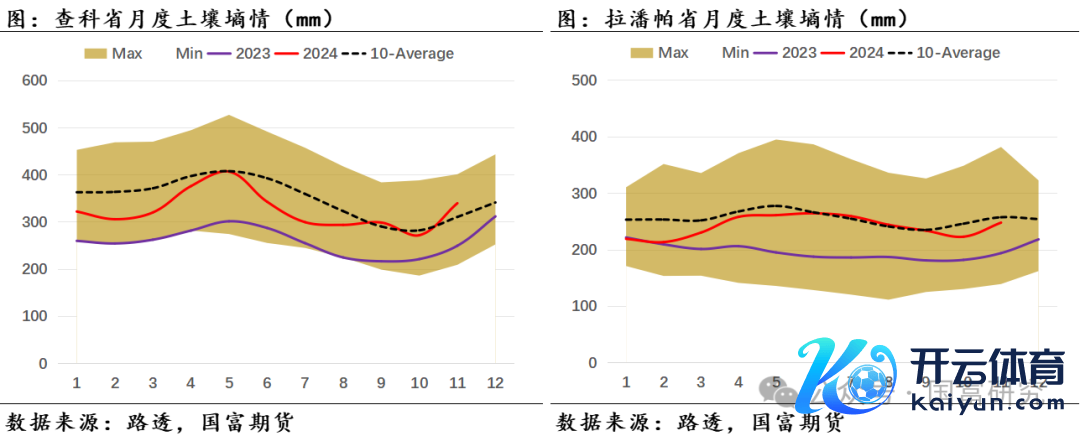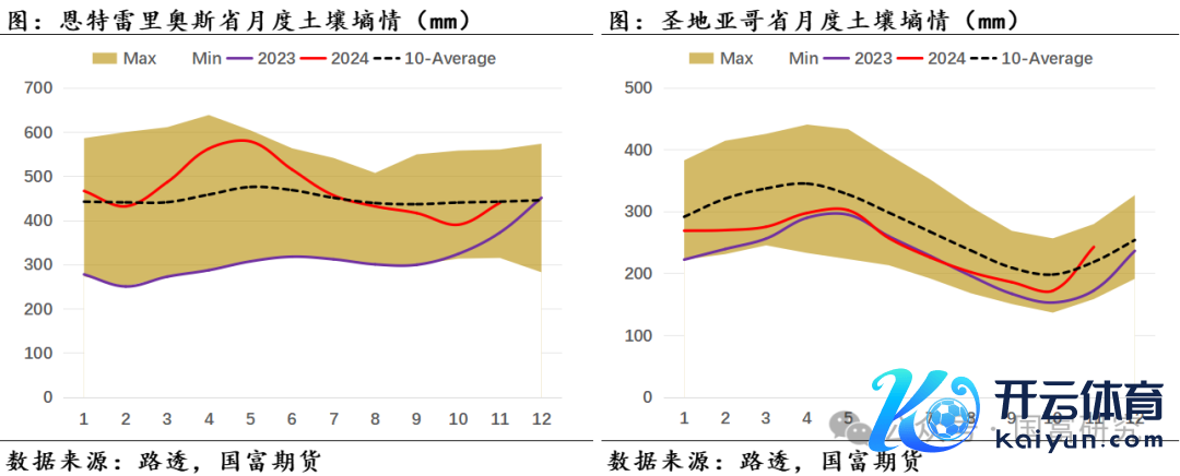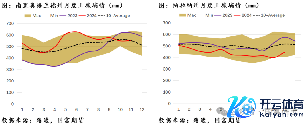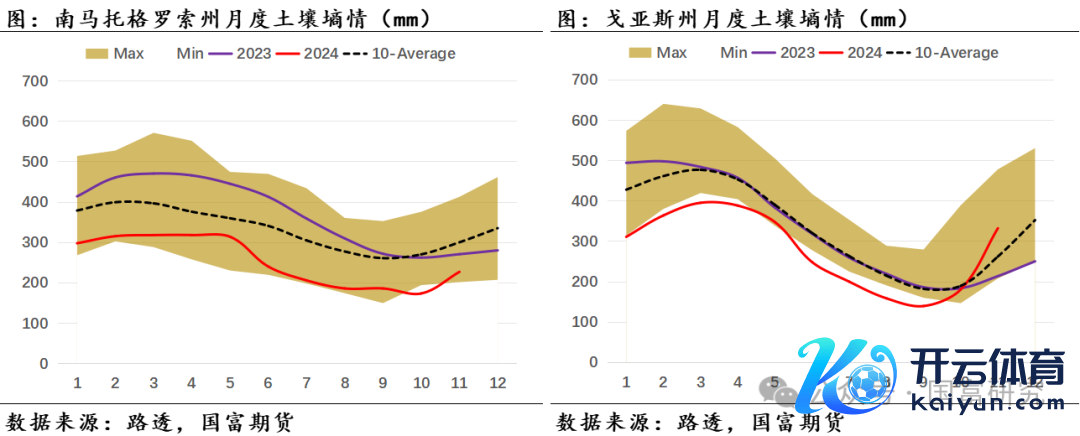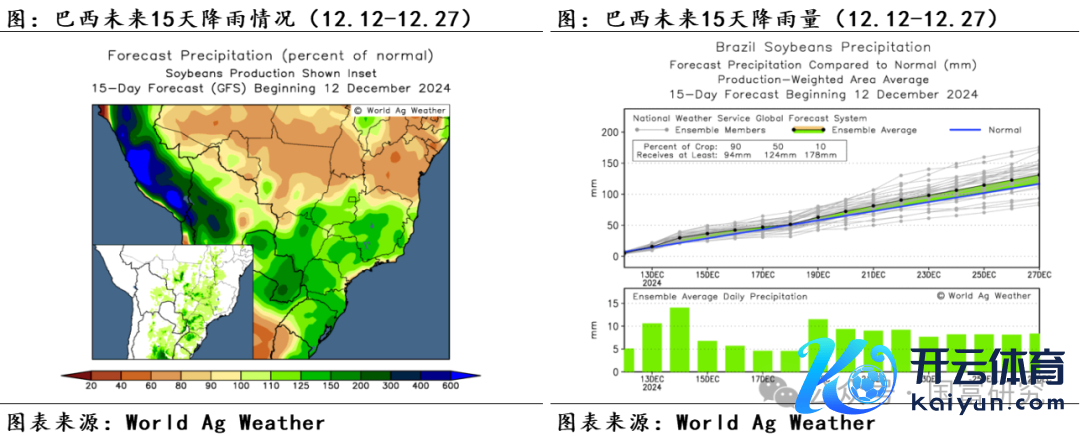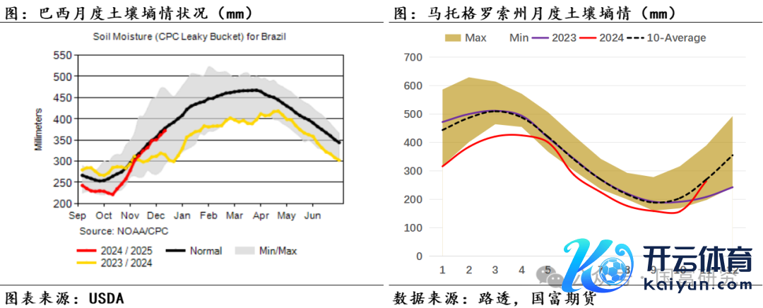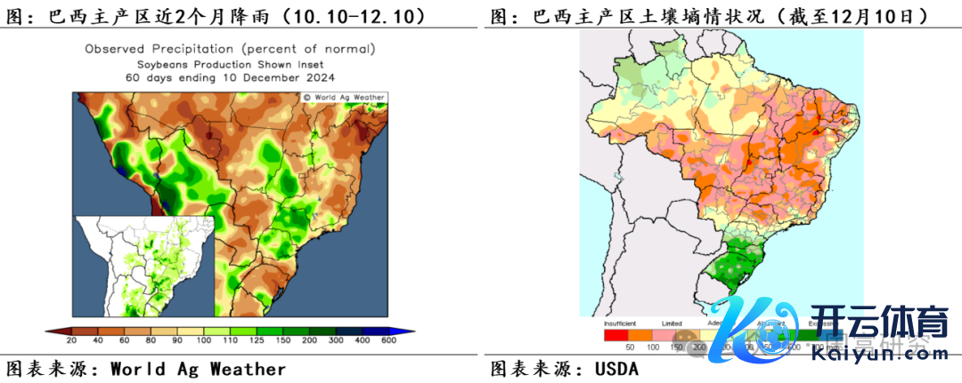 近期巴西大豆主产区的降雨情况精采,泥土墒情改善彰着。自11月起巴西大豆主产区降雨大幅改善,且握续位于历史均值水平。分区域来看,11月马托格罗索州(月度累计降雨量为185mm,后同)、帕拉纳州(134mm)月度降雨量与历史均值水平接近,戈亚斯州(213mm)略高于历史均值水平,南里奥格兰德州(89mm)、南马托格罗索州(103mm)略低于历史均值。受主产区合座降雨精采影响,11月巴西大豆主产区泥土墒情接近历史均值水平,固然帕拉纳州和南马托格罗索州的11月泥土墒情位于历史低位,但USDA最新数据知道,限度12月10日,帕拉纳州泥土水分足够且少部分地区的泥土湿度达600-700mm,接近过量(Excessive)水平,帕拉纳州的泥土墒情改善彰着。