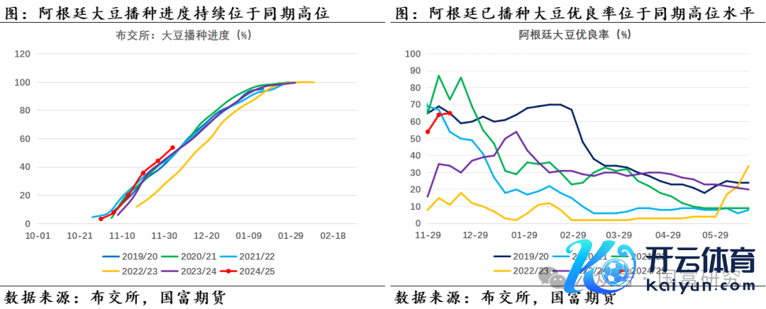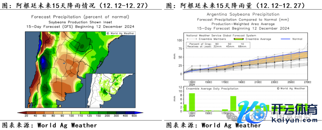 异日半个月的天气预告知道,阿根廷主产区降雨或减少,主产区平均日度降雨在2mm隔邻,尤其是布宜诺斯艾利斯省和圣菲省的部分区域降雨仅为时时水平的40%-60%,两省的其余区域降雨也仅为时时水平的60%-80%。但罗萨里奥交游所陈述称,由于NOAA/CPC瞻望拉尼娜气候在11月-来岁1月发生的概率降至57%(前一次瞻望概率为71%),这意味着12月降雨不利的可能性将缩小,或对阿根廷的夏令作物故意。详尽来看,面前精采泥土墒情仍故意于大豆滋长,降雨减少或进一步加速阿根廷大豆播撒经由,需要存眷产区后续降雨情况。凭证布宜诺斯艾利斯谷物交游所(以下简称布交所)公布周度数据,限度2024年12月12日,阿根廷大豆播撒经由为64.7%,已播撒大豆优良率为65%,均位于历史偏高水平。