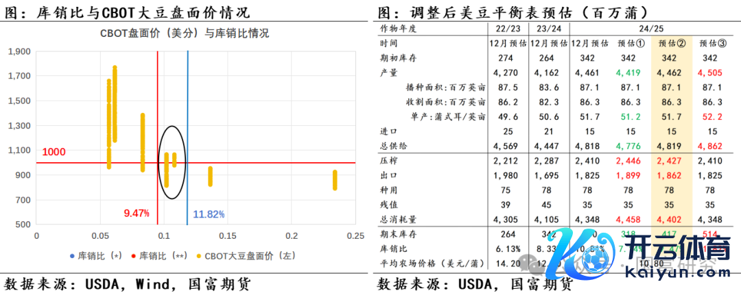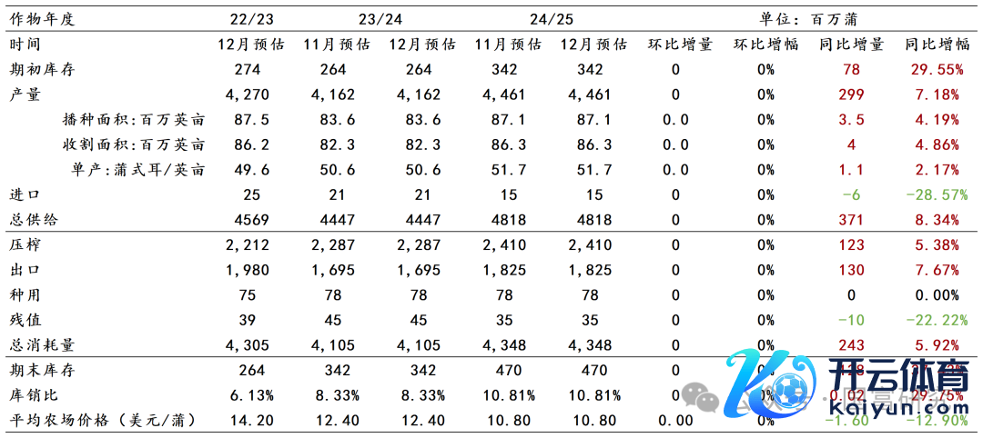 USDA 12月月报未对好意思豆均衡表作念调遣,24/25年度好意思豆期末库存保管4.7亿蒲预期,市集预估领域为4.30-4.86亿蒲,合乎市集预期,月报影响中性。
