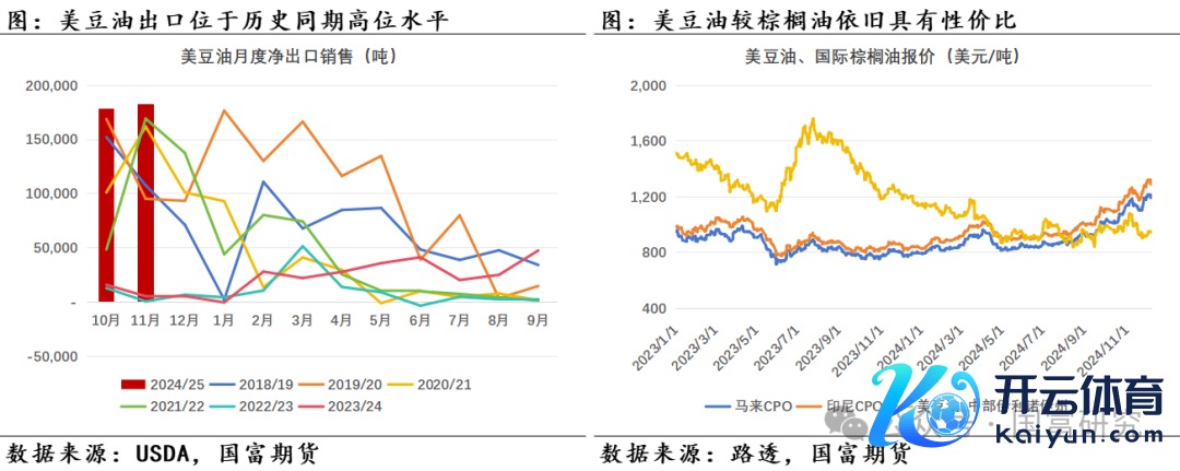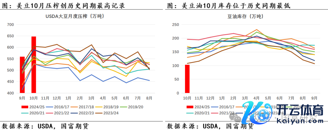10月好意思豆压榨络续创历史同期最高记录。凭证USDA压榨月报数据,好意思豆10月压榨量达647万短吨,24/25年度累计压榨量为1207万短吨,累计同比增幅为6.95%,略高于前一月的6.72%,且高于USDA月报预估增幅的5.38%。同期,月报数据知道10月好意思豆油库存降至历史同期最低水平,且现在好意思豆油较棕榈油有较好的性价比上风,好意思豆油出口需求较为矫健,短期来看好意思豆压榨瞻望保管高位。