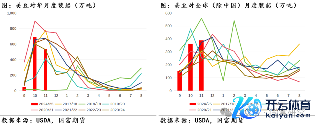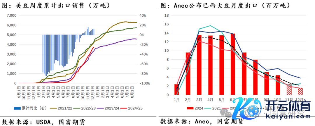 好意思豆周度出口环比下滑,但累计同比增幅络续走扩,短期好意思豆出口需求保管矫健。凭证USDA公布周度出口数据,2024年12月5日当周,好意思豆24/25年度出口为117.38万吨,较前一周的231.27万吨大幅下滑,且低于市集预期150万吨至220万吨。限度2024年12月5日,好意思豆累计出口量已达3728万吨,同比增幅为12.01%,增幅较前一个周11.84%略有高潮,且高于USDA 12月月报预估的7.67%同比增幅。面前好意思豆销售经由已达USDA预估策画的75.07%,客岁同期为71.94%,近五年均值为73.66%。