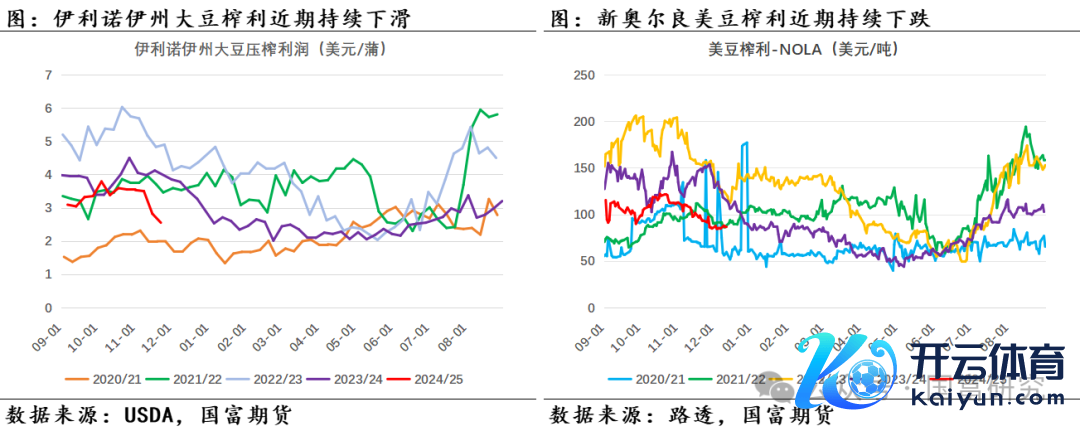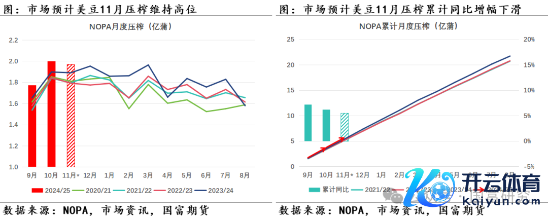 11月好意思豆压榨或保管历史高位,不外累计同比增幅或缩窄。凭证NOPA 11月压榨数据公布前的分析师预期访谒知道,市集瞻望11月好意思豆压榨为1.96713亿蒲,预估领域为1.91亿蒲至2.07亿蒲,好意思豆11月压榨瞻望保管历史同期高位水平。诱导预估数据,限度2024年11月好意思豆24/25年度累计压榨量瞻望为5.74亿蒲,累计同比增幅下滑至5.47%,前一月为6.22%,好意思豆累计压榨同比增幅或出现下滑趋势。同期,探求到近期好意思豆榨利握续走软以及好意思国生柴战略的不笃定性,后续好意思豆压榨同比增幅预估领域为5.38%至6.95%,中值为6.12%。