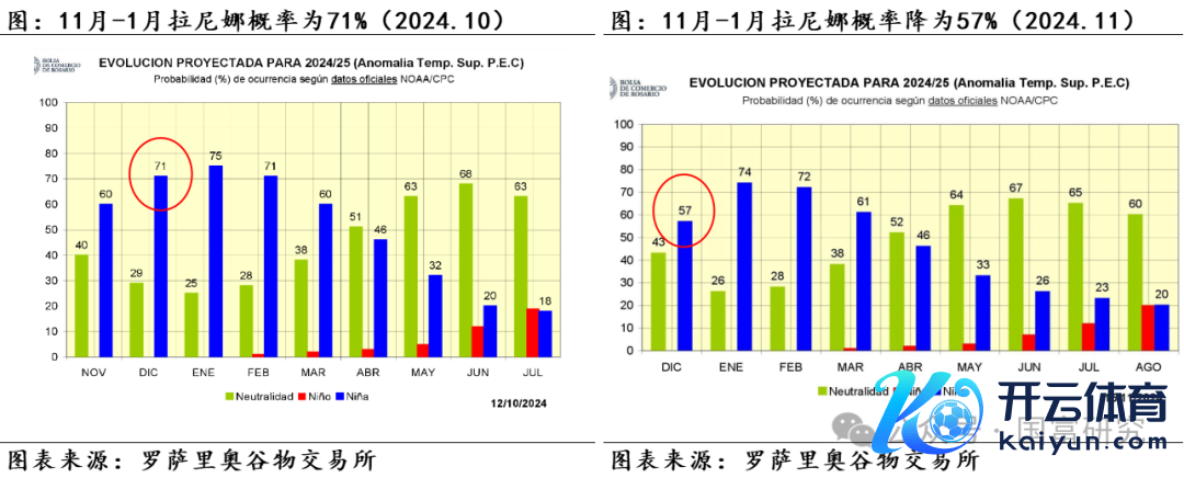 USDA在这次月报将阿根廷大豆产量预估上调100万吨至5200万吨,罗萨里奥交游所瞻望产量为5300万吨至5350万吨,布宜诺斯艾利斯谷物交游所瞻望阿根廷大豆产量为5250万吨,均标明阿根廷新作大豆产量出息预期较好。综上,受前期精采天气影响,阿根廷大豆播撒和滋长景况向好,且罗萨里奥交游所瞻望拉尼娜出现的概率下滑进一步强化阿根廷大豆丰产的预期。