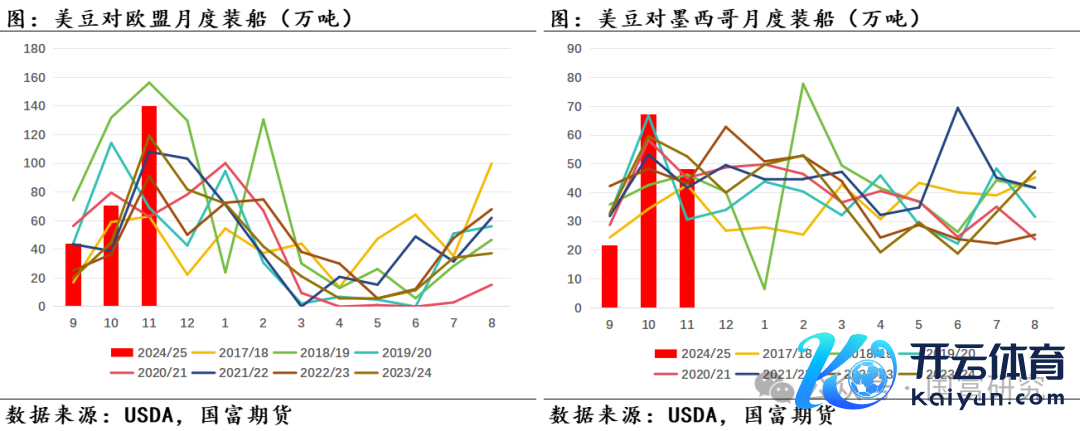 近期24/25年度好意思豆销售经由偏快,主要因第四季度为好意思豆出口窗口期,且本年巴西大豆出供词应较历史同期大幅减少,好意思豆出口市集受挤占程度松开。Anec瞻望第四季度巴西大豆出口量为435万吨,较近五年第四季度出口均值873万吨显耀减少。不外中弥远好意思豆出口需存眷生意说合变化对生意流的影响。USDA数据知道,11月好意思国对华大豆出口出现大幅下滑,或部分削减对好意思豆出口需求的支握。不外现在好意思国对其他主要出口国的大豆出口情况依然矫健,10-11月好意思国对欧盟、墨西哥(两国共占好意思豆对除中外洋的其他国度出口总量的42%)出口量位于历史同期高位。不外特朗普声称后续将要加多出口关税,后续生意说合或发生变化,需要存眷特朗普上任后的生意说合转机对好意思豆生意流的影响。详尽来看,咱们对好意思豆24/25年度出口预估增幅领域暂为7.67%-12.01%,中值为9.84%。