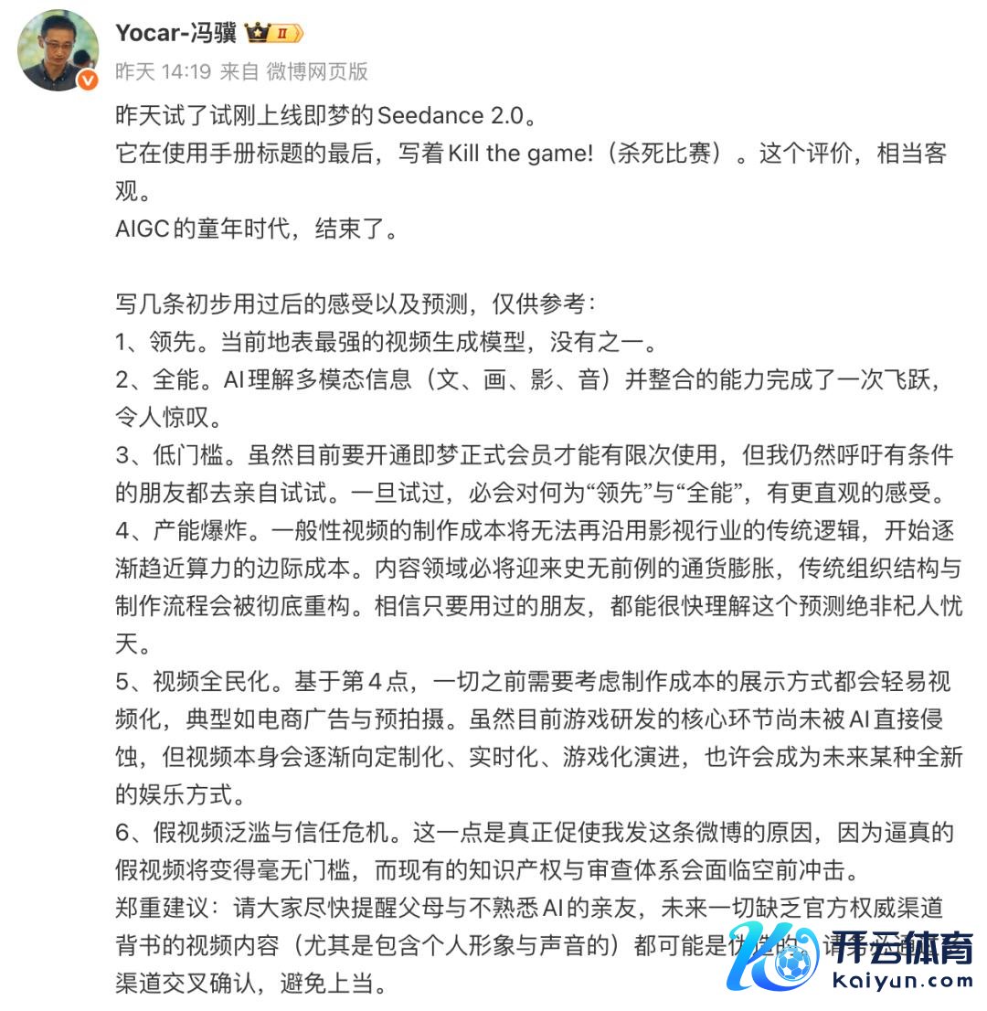 随后,《黑外传:悟空》制作主说念主冯骥发长文标明我方关于Seedance 2.0的感受,并用到“AIGC的童年期间达成了”,来招供“Kill the game!”这句宣传语。