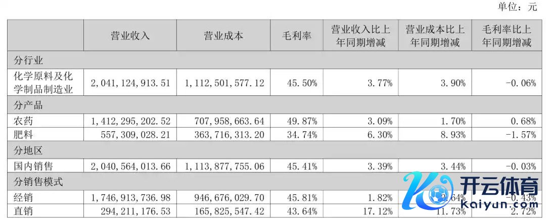敷陈期内,公司主要从事行业的毛利率承压。从收入结构来看,农药算作主力居品,营收占比近七成,毛利率仅微涨0.68个百分点;肥料收入同比增6.30%但毛利率下滑1.57个百分点。分方式看,直销增速17.12%远超经销的1.82%,且毛利率进步2.72个百分点。